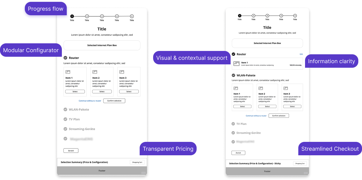 "As a customer configuring a telecom package, I can move through a clear, step-by-step modular flow, where my progress is always visible and I am only presented with decisions relevant to the current stage. I can confidently check out because the pricing is transparent and I have the freedom to review or change previous selections easily. So that I feel informed and in control, leading to a high-confidence purchase completion."