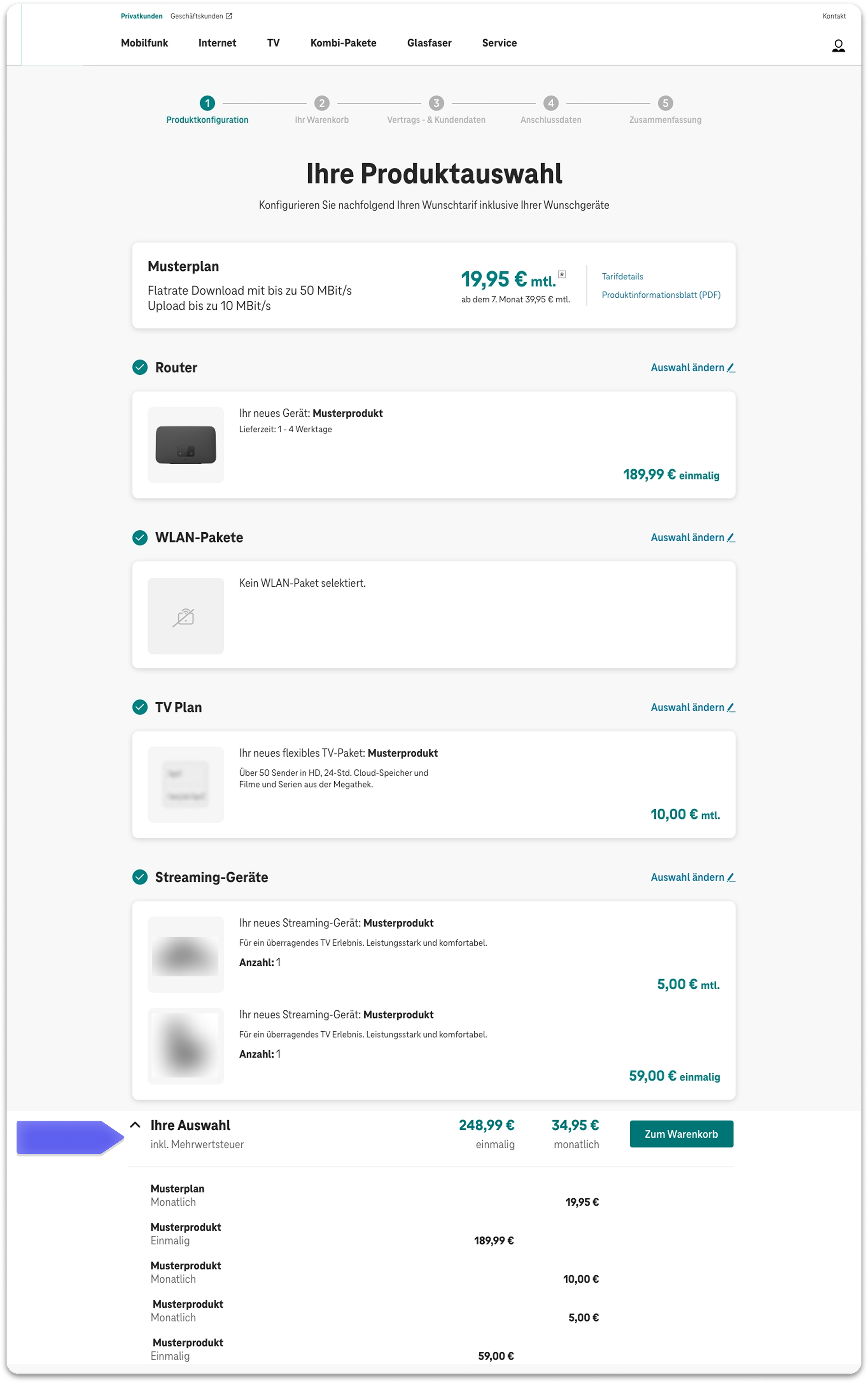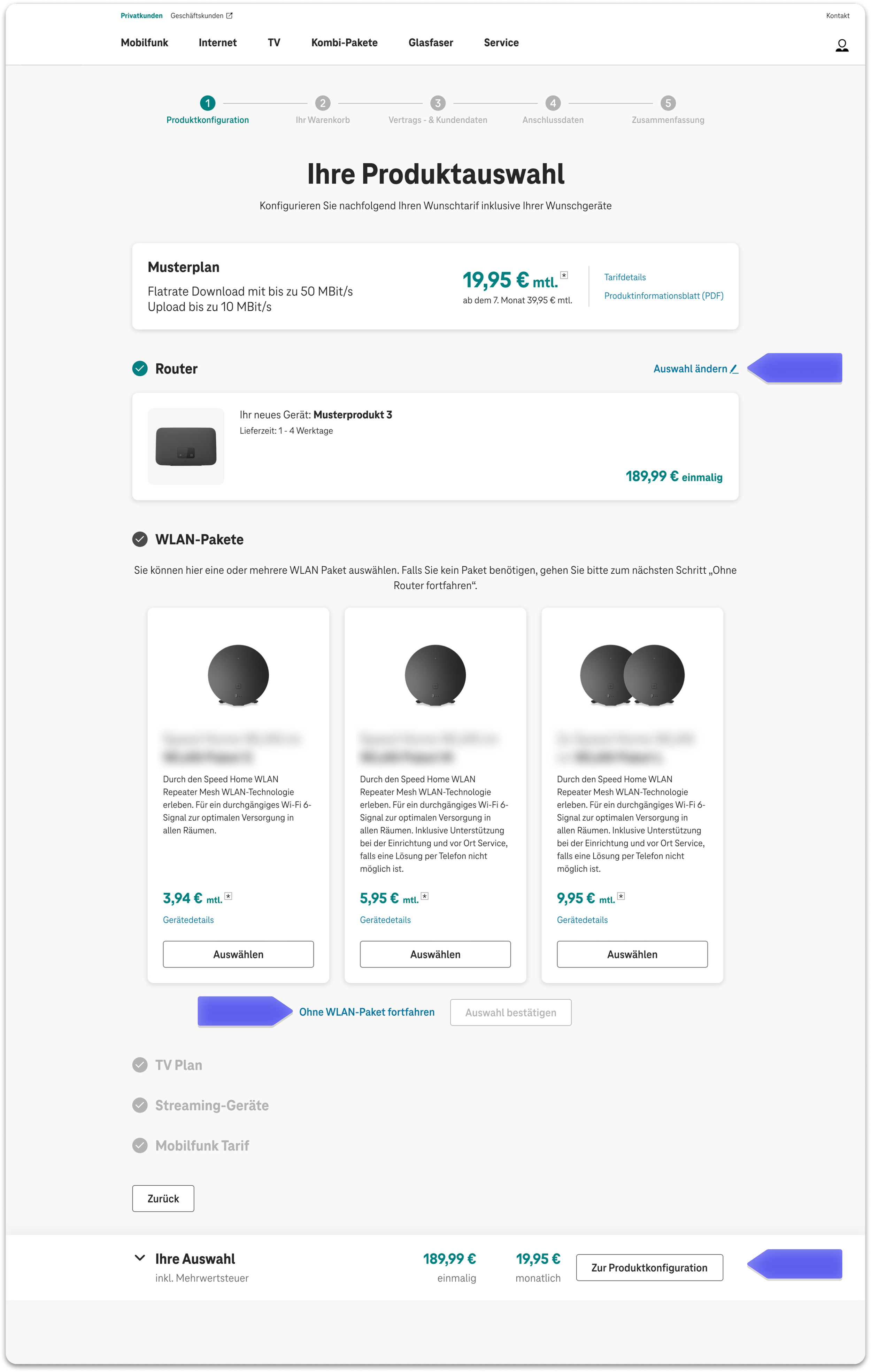 The design resolves previous user frustration by providing clear routes for process control. Customers can instantly change selections via the "Auswahl ändern" links and skip modules, and use the persistent navigation.